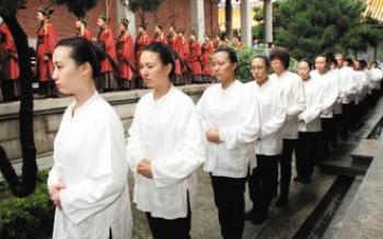 台北孔庙祭孔典礼首次由女学生担任礼生。图片来源:台湾《联合报》 中新网2月27日电 据台湾《联合报》报道,台北孔庙2012“春祭”典礼昨天登场,今年首度打破传统,由台湾明伦高中的女学生担任礼生,是孔庙举办祭孔大典81年来首例。